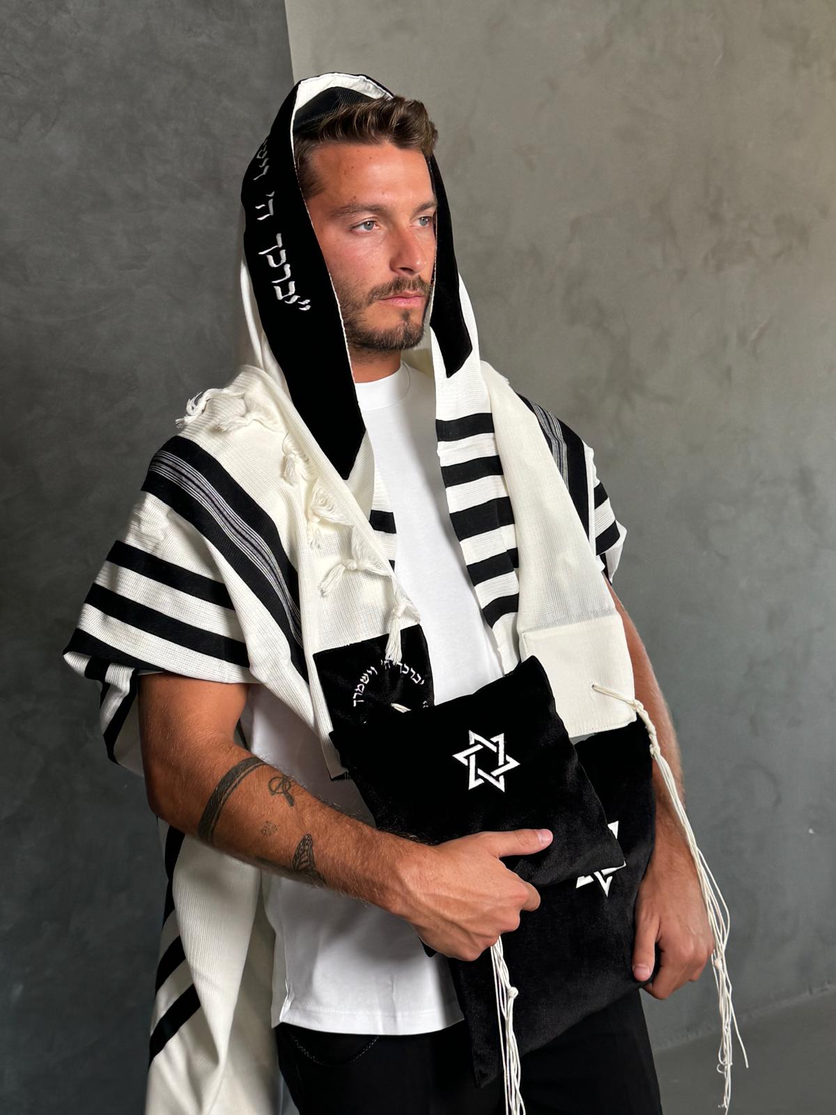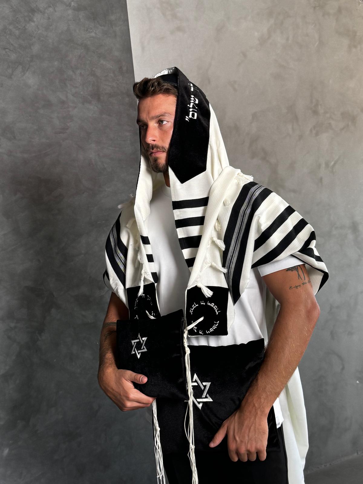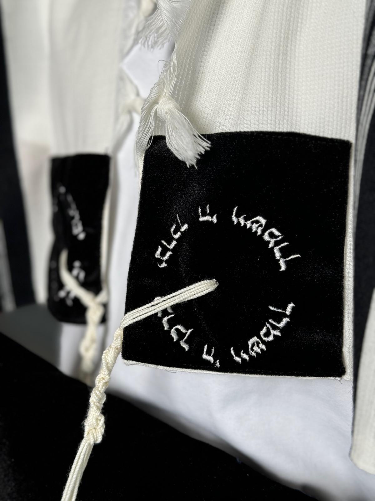 מגיע קטיפה בגוון שחור רקום יברכך מעוגל בצורנ מיוחדת ויפה בארבע כנפות הטלית,