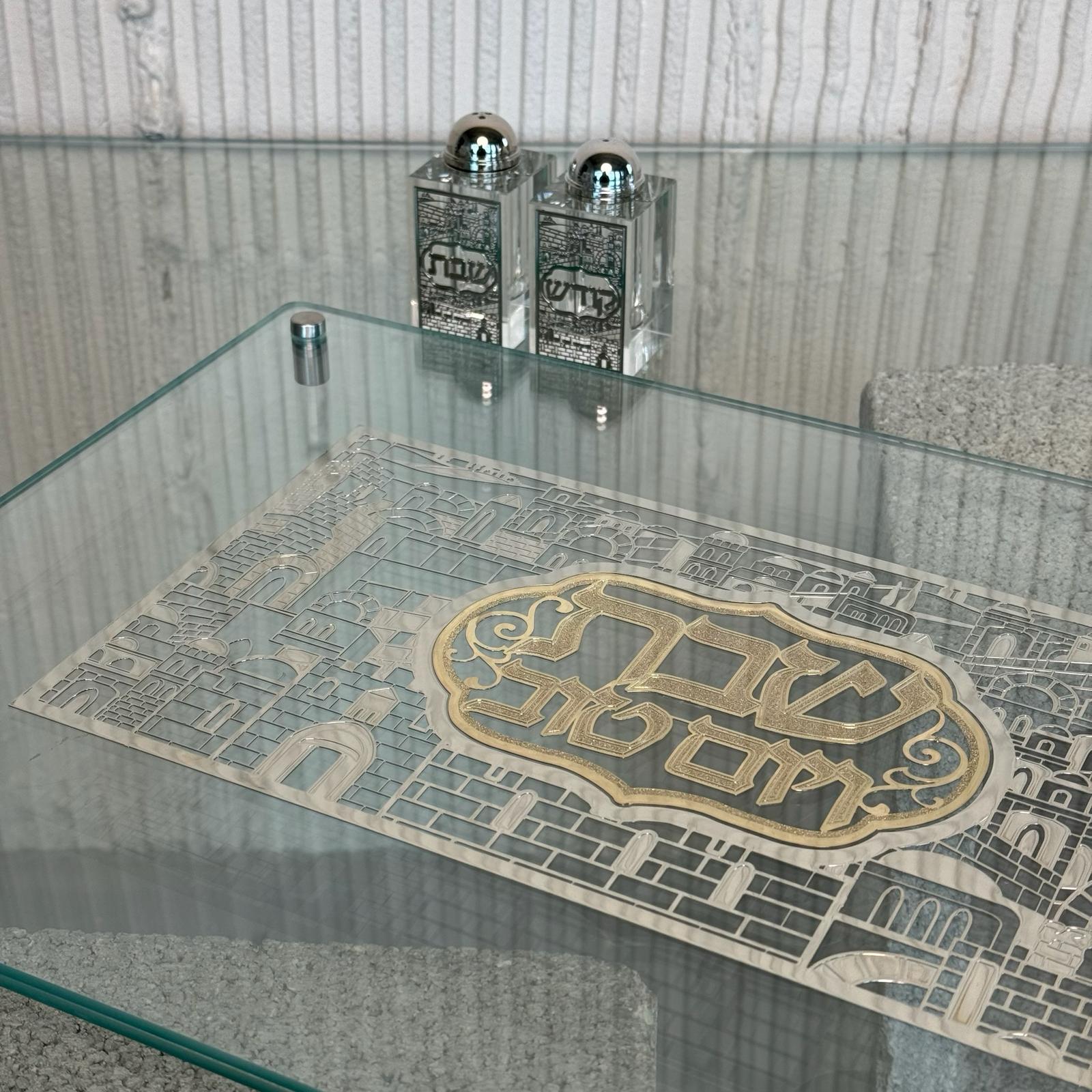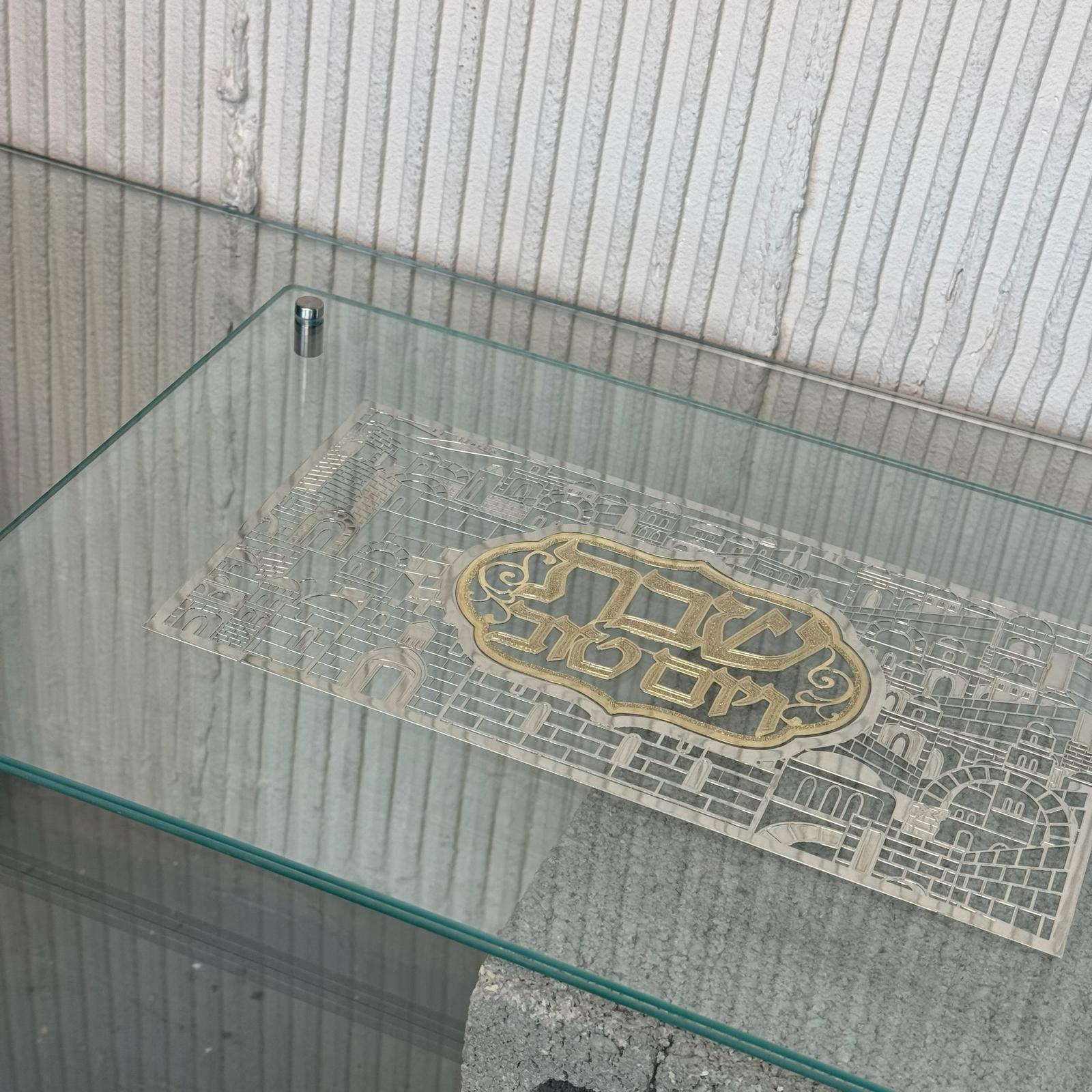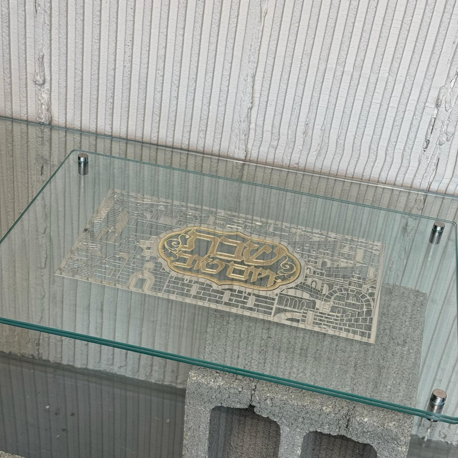 מגש חלה מהודר מזכוכית עם פלקטה ירושלים