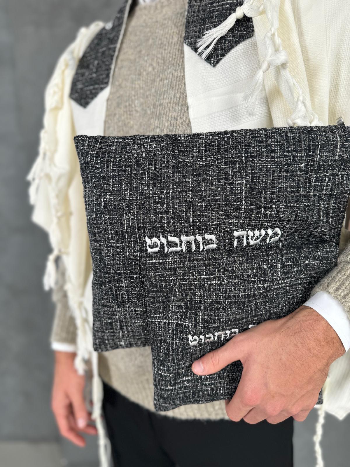 סט כיסויים מבד פשתני בגוון שחור עם נגיעות שמנת בתוספת ריקמה בגוון שמנת בהיר הנתנת לשינוי ע״י הלקוח.