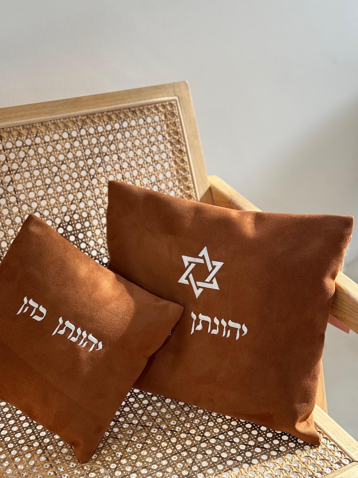 סט כיסויים מבד ז׳מש חום מושלם בתוספת ריקמה בגוון שמנת בהיר הנתנת לשינוי ע״י הלקוח.