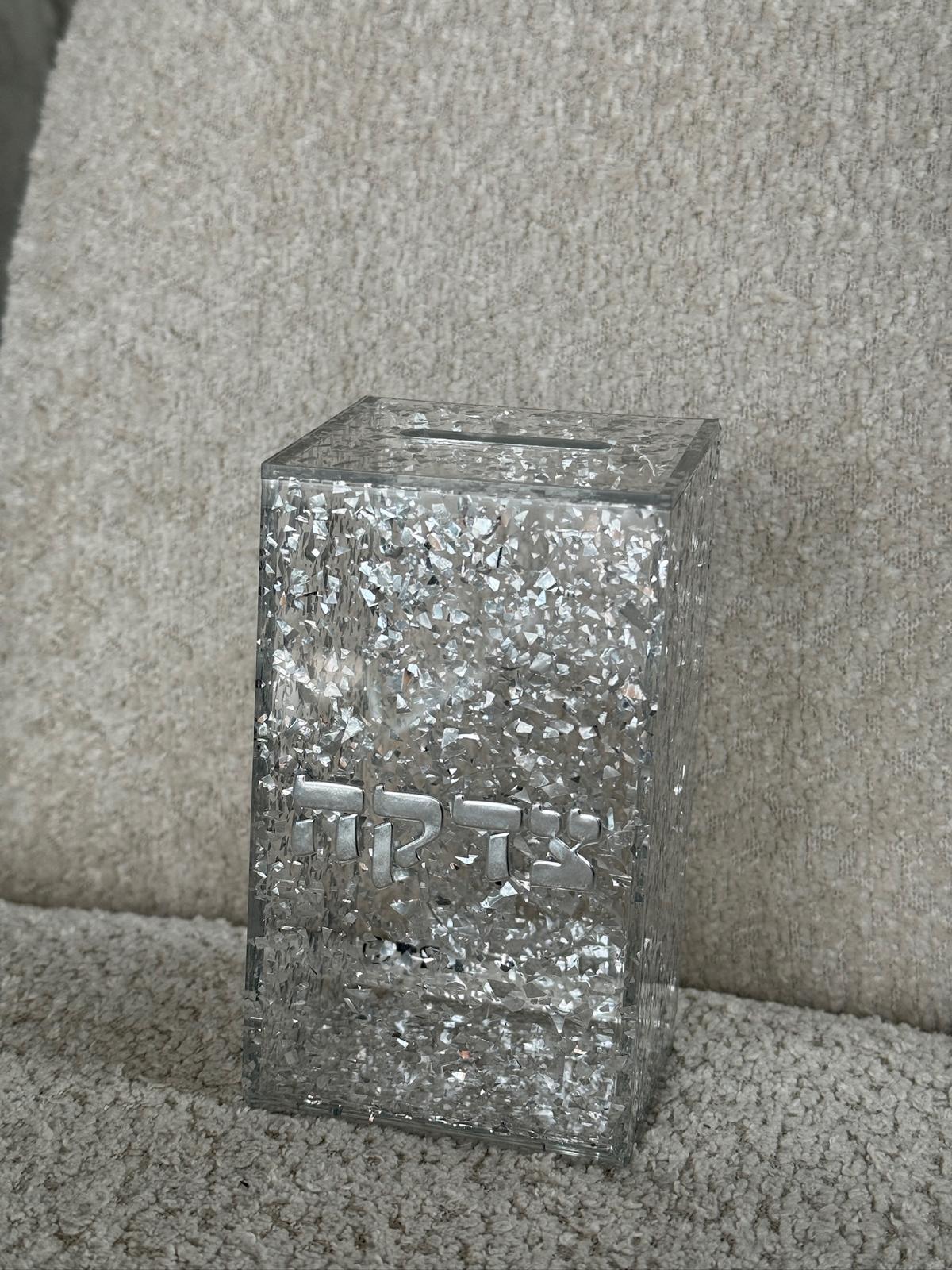 קופת צדקה פרספקס שקופה בשילוב נצנץ כסף